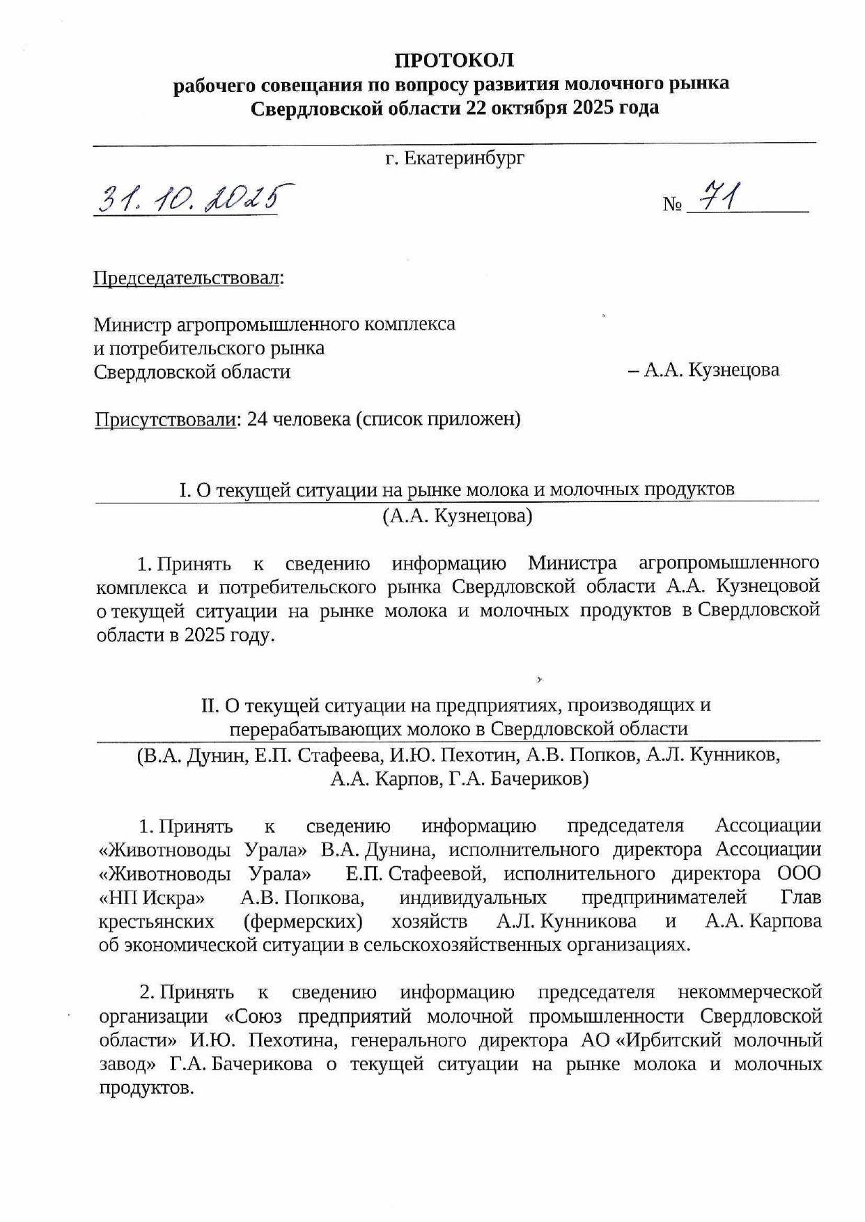 На встрече с докладом от имени Ассоциации выступили: председатель В.А. Дунин, исполнительный директор Е.П. Стафеева и член правления Ассоциации Попков А.В. В дискуссии также приняли участие члены правления и партнеры Ассоциации "Животноводы Урала": генеральный директор АО "Совхоз "Сухоложский" Н.В. Мошегова, зам. директора по науке НКО Ассоциация производителей КРС голштинской породы М.В. Ряпосова, исполнительный директор ООО "Агропромышленный комплекс имени Ленина" И.А. Казанцев, председатель СПК "Птицесовхоз "Скатинский" Е.А. Башкова, генеральный директор АО "Каменское" Л.Д. Двинина, генеральный директор ООО "Новопышминское" Л.П. Вяткина, директор ООО "Яр" С.В. Филистеева и председатель СПК "Колхоз имени Кирова" Т.Г. Сенцова.